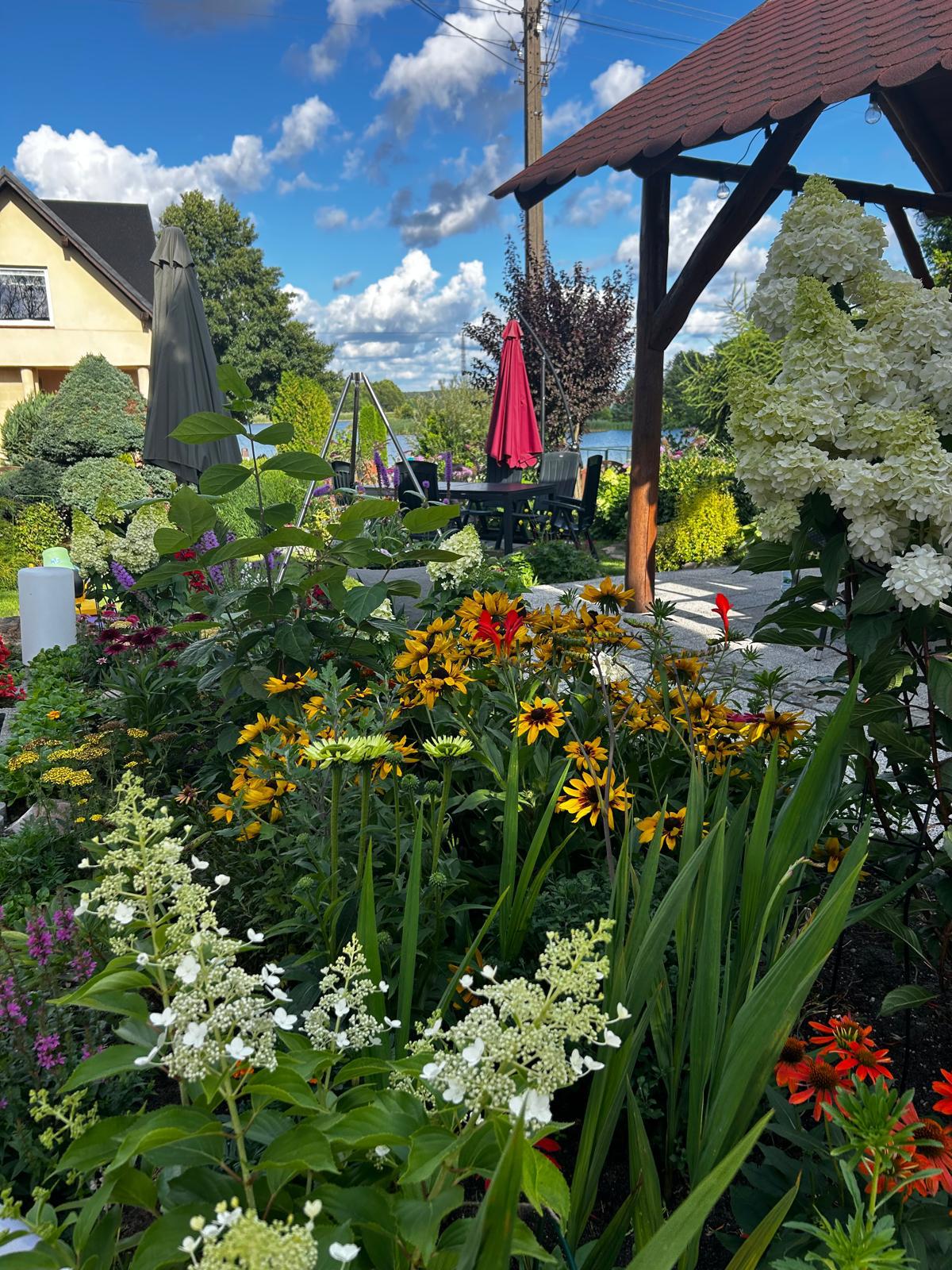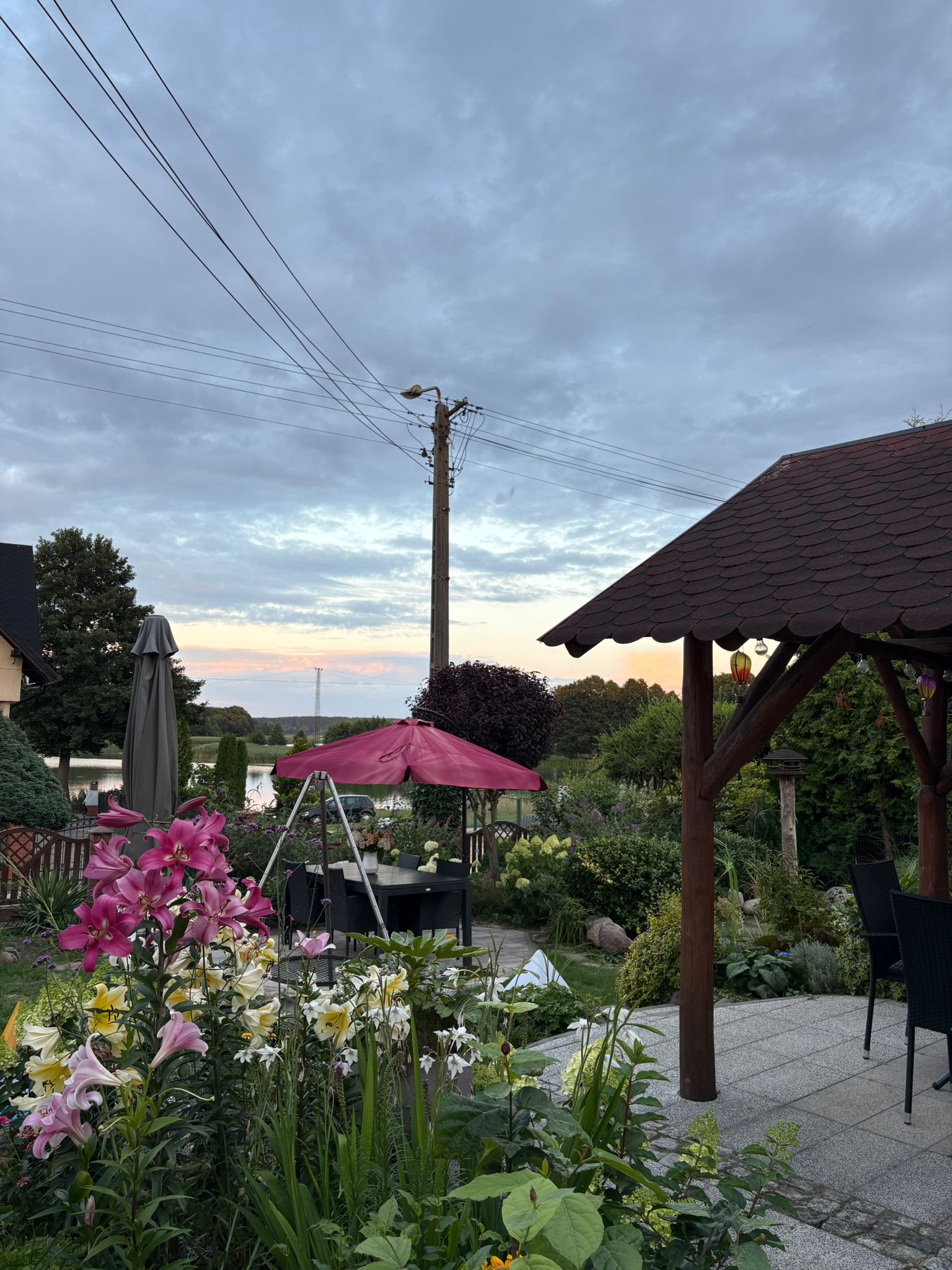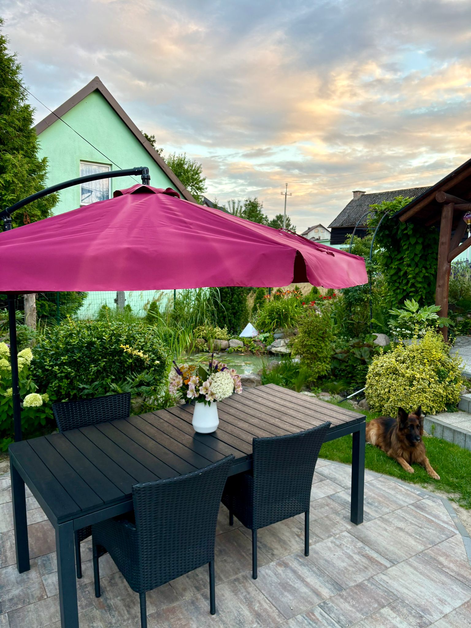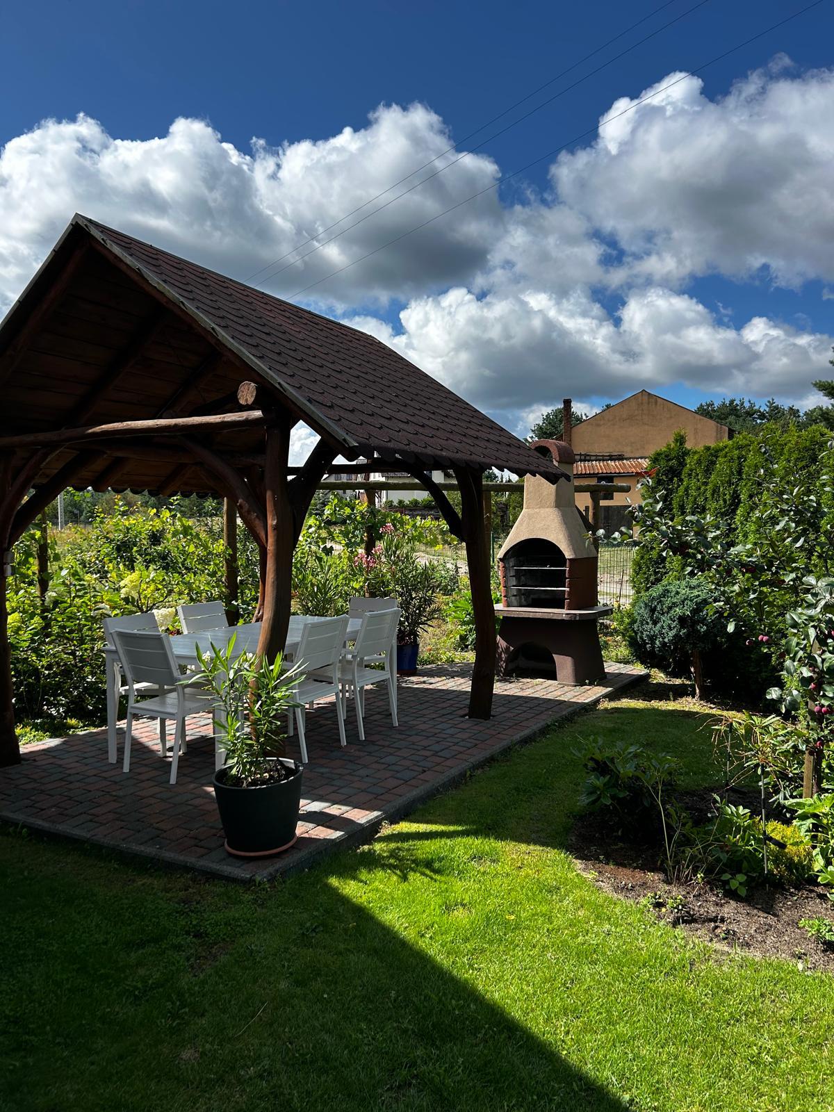 w ogrodzie znajdują się ławki, stoliki, huśtawka, oczko wodne oraz dwa grille ogrodowe,