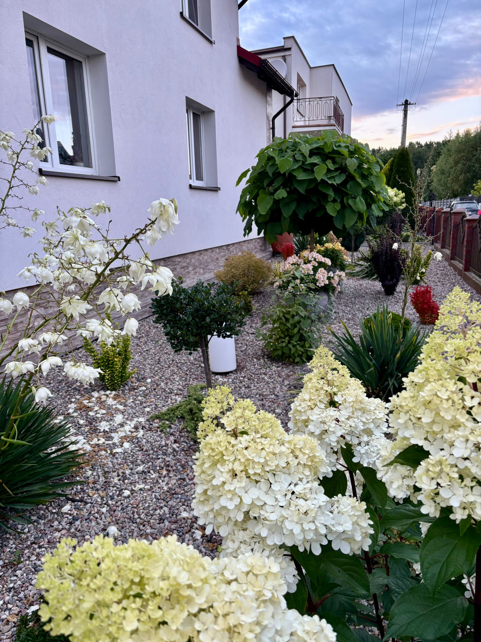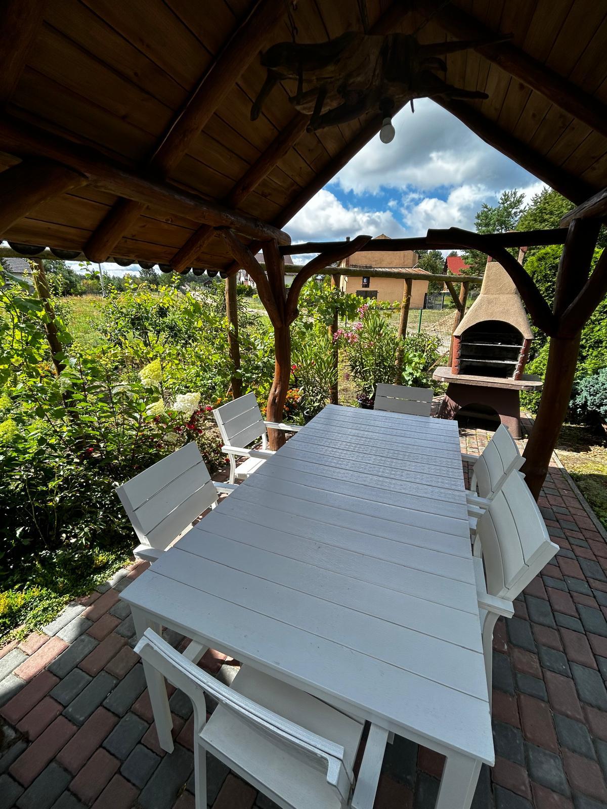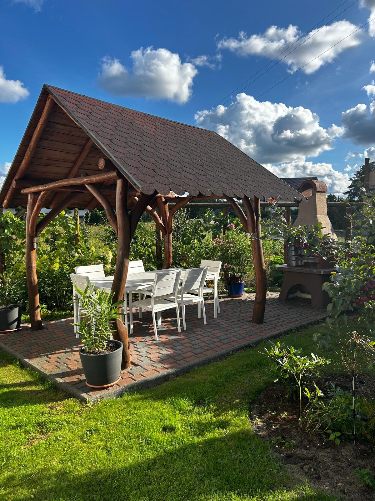 w ogrodzie znajdują się ławki, stoliki, huśtawka, oczko wodne oraz dwa grille ogrodowe,